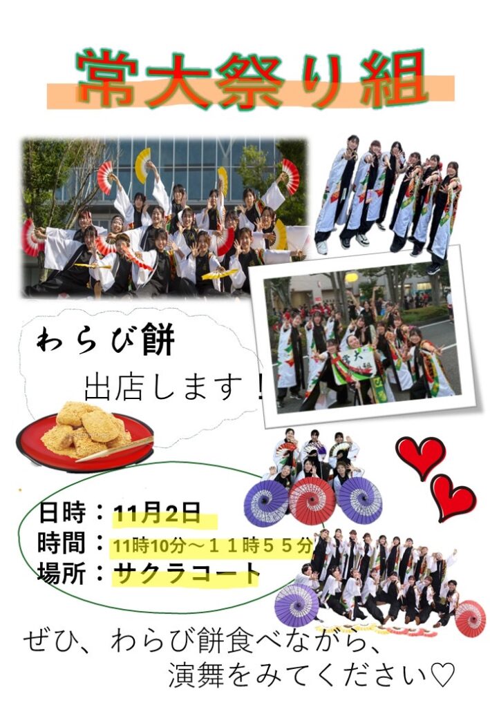 こんにちは。21代目常大祭り組です。今年も心薙祭のステージに立てることがとても嬉しいです。学祭に向けて日々練習を重ねてきました。私たち21代目にしかできない笑顔溢れるステージに仕上がっていると思います。元気と笑顔を届けられるよう精一杯演舞します!ぜひ見に来てください!わっしょーい!