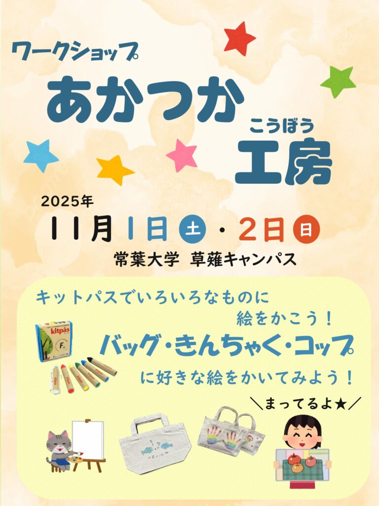 書いて消せる不思議なクレヨン『キットパス』を使ってバックやコップにお絵かきしよう!色とりどりのクレヨンで、好きな絵や模様をかけば、世界に一つだけのすてきな宝物になるよ!誰でも自分のペースで楽しめるワークショップです。あかつか工房で楽しいアート体験をしてみよう!