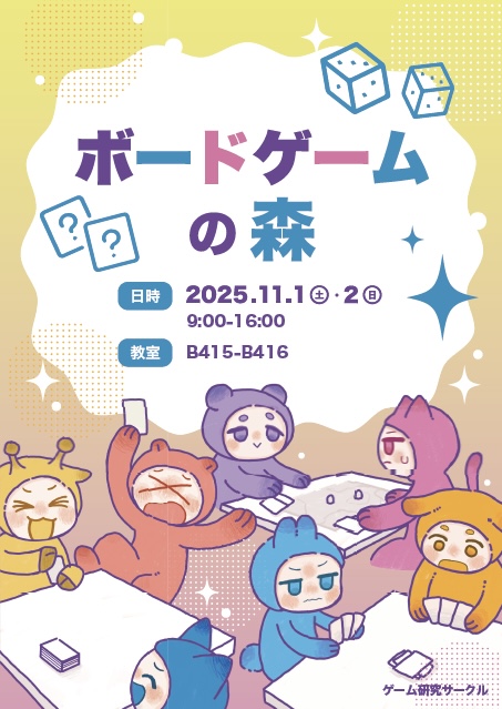 ボードゲームの展示と体験を行っています!展示しているボードゲームのなかで気になるボードゲームがあれば、実際に体験ができます。体験のテーブルには一人以上スタッフがいるので、初めての方でも大丈夫です。お気軽にご来場ください!是非、一緒にボードゲームで盛り上がりましょう!
